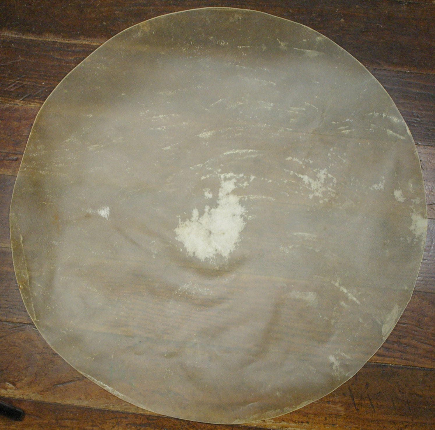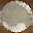 CS-D-15 皮の直径 約54-55cm 重さ : 346g ¥8,500 (税込み) SOLD ありがとうございました 西アフリカの牛皮。毛剃してあります。ヤギのごく厚皮位の感触です。 写真右側白い部分、薄くなっています。 |