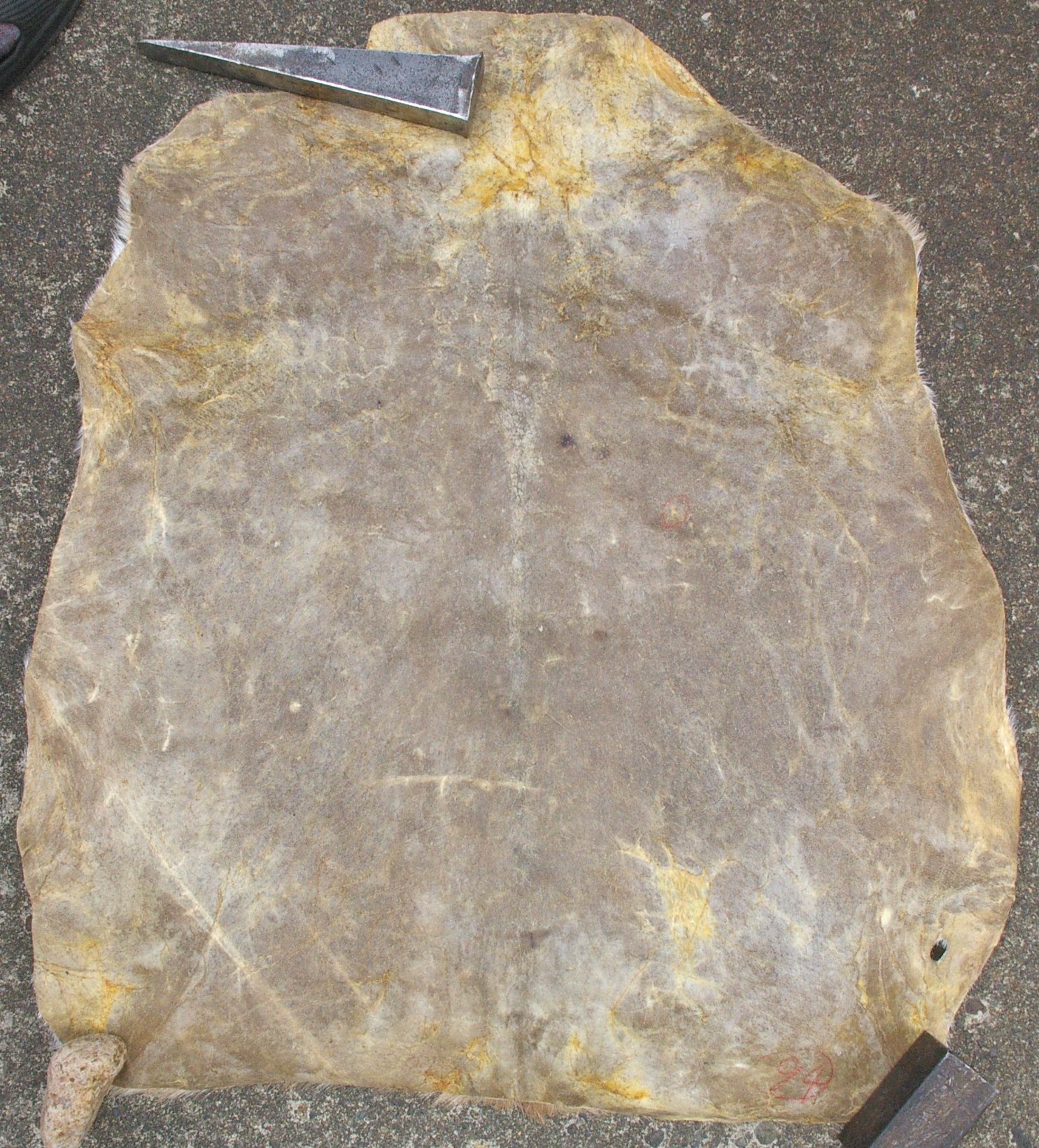 裏面 GS-101 縦:103cm x 幅:92cm 重さ:689g 中〜厚め パキスタン産 状態が良い皮です とても大きく2面〜とれるかもしれません ¥10,500 (税込み) SOLD ありがとうございました |