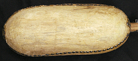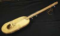 です。当店でギター用のペグを装着、仕上げしました。高音3弦は開放弦です。最低音弦は本来開放弦の設計ですが、主2弦とともに革紐にはさんでみましたので、押さえて弾く事も出来ます。最低音弦を革紐から外すセッティングにするとスケールが長いドローン弦になります。革紐は無くても演奏に支障はありませんが、主弦を解放した時のトラディショナルタイプと同様の微妙な音色のために巻いてみました。竿部分はバラフォンウッド、胴は白木です。牛皮、ナイロン弦。ブリッジ部分は瓢箪製、弾きやすいように工夫して加工し直し、弦の位置決を調整しました。サンプル音のチューニングは一例です。